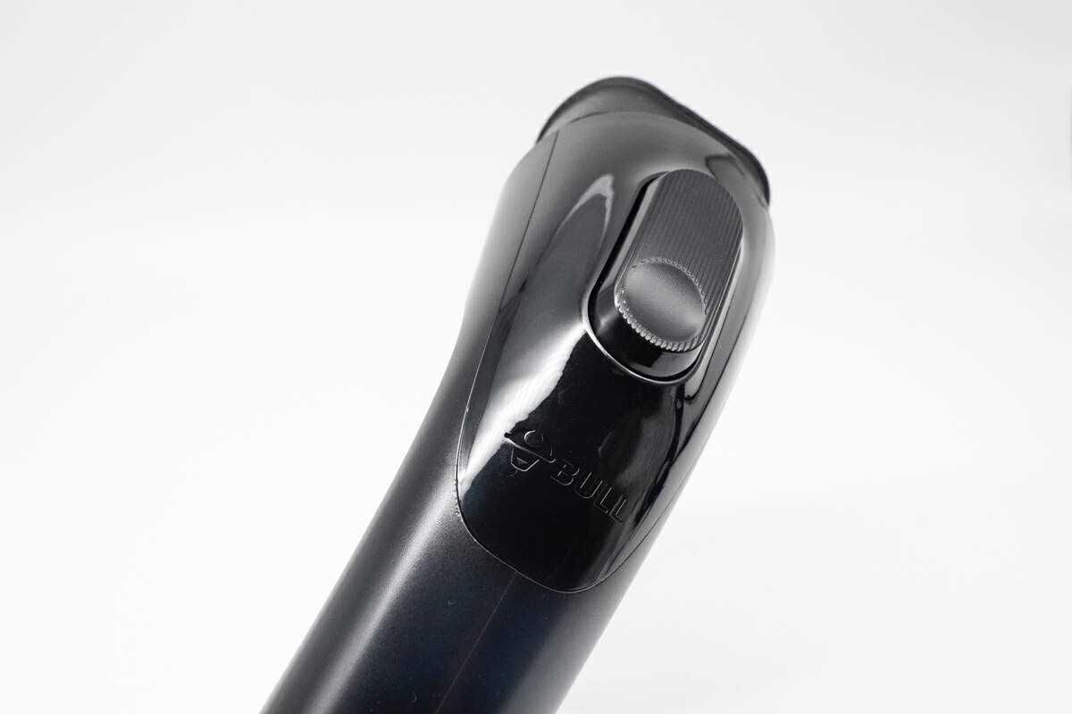 枪头部分采用了亮黑加烤漆黑的外观设计,正面凹印着公牛BULL的品牌LOGO,同时枪体握把处设有锁定按键,搭配车辆电子锁功能后,安全不掉落,防止误拔。