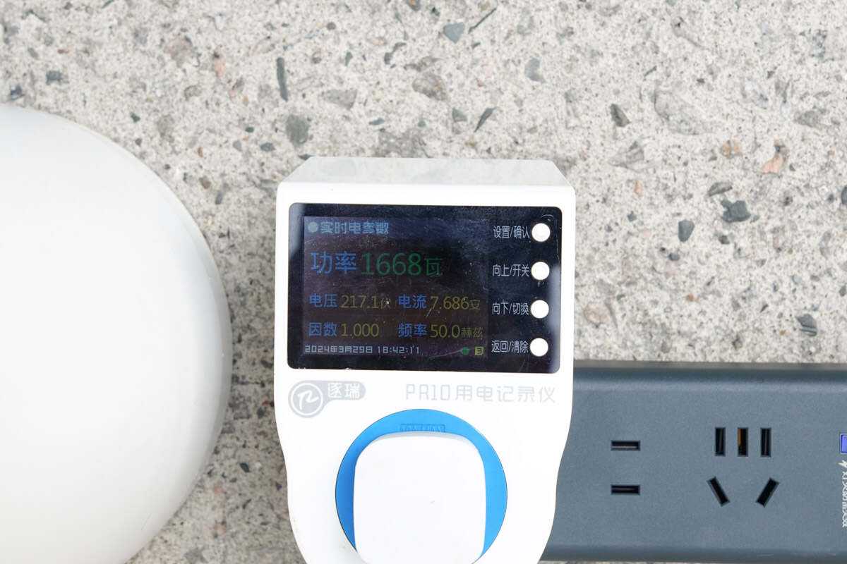 将电烧水壶连接公牛安全放电插座,用电记录仪读取功率为217.1。
