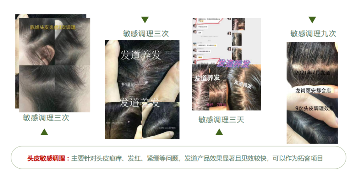 首先,发道的养发服务不仅包括白发养黑、防脱育发、头皮及头发的基础护理,还包括头皮补水,烫染排毒,头油头屑调理以及发干修复。主要针对有头发及头皮养护需求的人群、在意生活品质以及愿意预防头发问题的人群。
