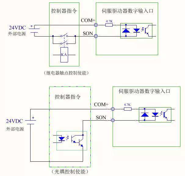 数字输入口常用的信号是使能信号SON,不加使能信号,伺服电机轴不锁止,可自由转动;加上使能信号后,电机轴锁止,此时发位置脉冲,电机就会带动工作台移动;只发脉冲而不加使能信号,电机不会转动。可以用SON信号控制电机的转动和停止,但一般用脉冲控制电机启停,连续发脉冲则伺服电机连续旋转;不发脉冲电机就停转。数控系统检测到伺服驱动器报警信号或系统其它功能电路报警,都会停发脉冲并断开使能信号。