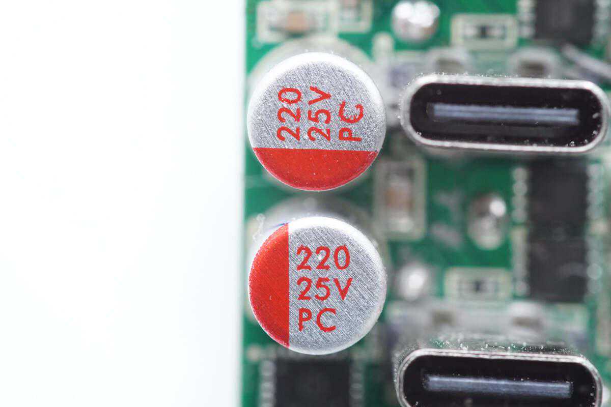 充电器输出端焊接两颗滤波电容和输出小板,在小板上焊接USB-C母座和USB-A母座,以及两颗滤波电容。