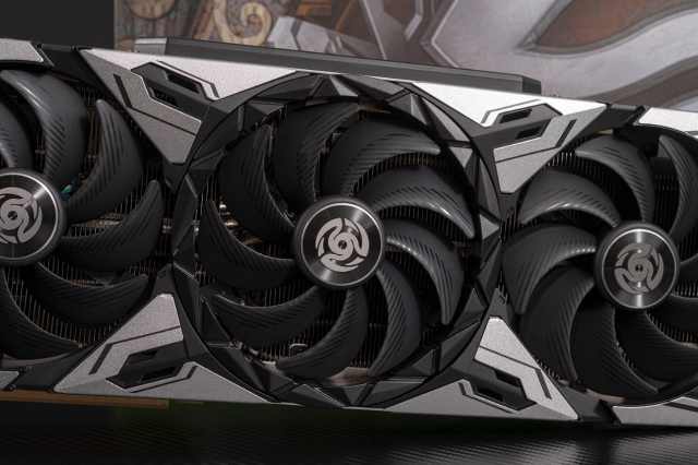 显卡厚度也来到了3.5槽,带上背后两个小散热风扇,整张卡的厚度将近74mm,这对一些比较小的机箱会是不小的挑战。