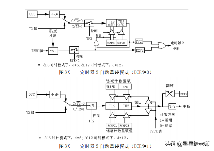 在捕获模式中,通过T2CON中的EXEN2设置2个选项。如果EXEN2=0,定时器2作为一个16位定时器或计数器(由T2CON中的C/位选择),溢出时置位TF2(定时器2溢出标志位)。该位可用于产生中断(通过使能IE寄存器中的定时器2中断使能位)。如果EXEN2=1,与以上描述相同,但增加了一个特性,即外部输入T2EX由1变0时,将定时器2中TL2和TH2的当前值各自捕获到RCAP2L和RACP2H。另外,T2EX的负跳变使T2CON中的EXF2置位,EXF2也像TF2一样能够产生中断(其向量与定时器2溢出中断地址相同,定时器2中断服务程序通过查询TF2和EXF2来确定引起中断的事件),捕获模式如图X所示。在该模式中,TL2和TH2勿重新装载值,甚至当T2EX产生捕获时间时,计数器仍以T2EX的负跳变或振荡频率的1/2(12时钟模式)或1/6(6时钟模式)计数。