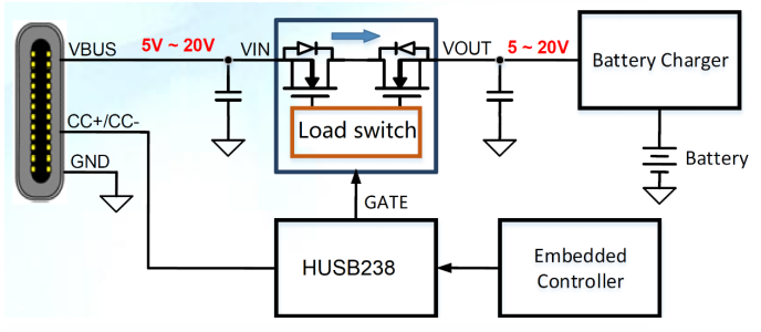 HUSB238系统图如图5所示。HUSB238与USBPDSource通信,通过USB-C连接器实现USBType-C和PD握手。HUSB238能够控制负载开关,实现VBUS过压保护、欠压保护、过流保护和反向电流阻断。嵌入式控制器可以通过I2C接口访问HUSB238进行监控和高级设置。