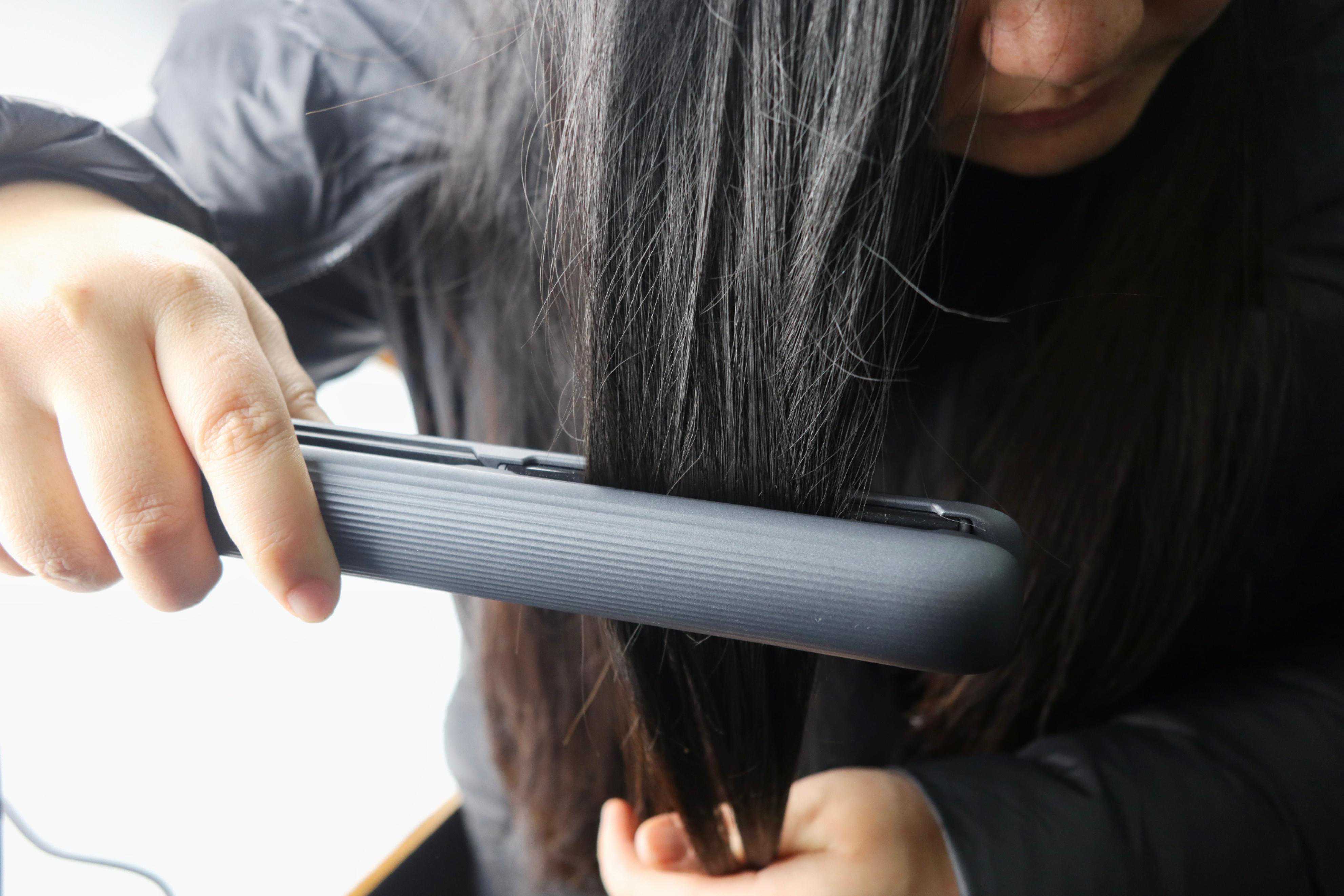 夹板直线往下顺移,另外一只手可以固定发尾或将直发器另外一端拿住往下移