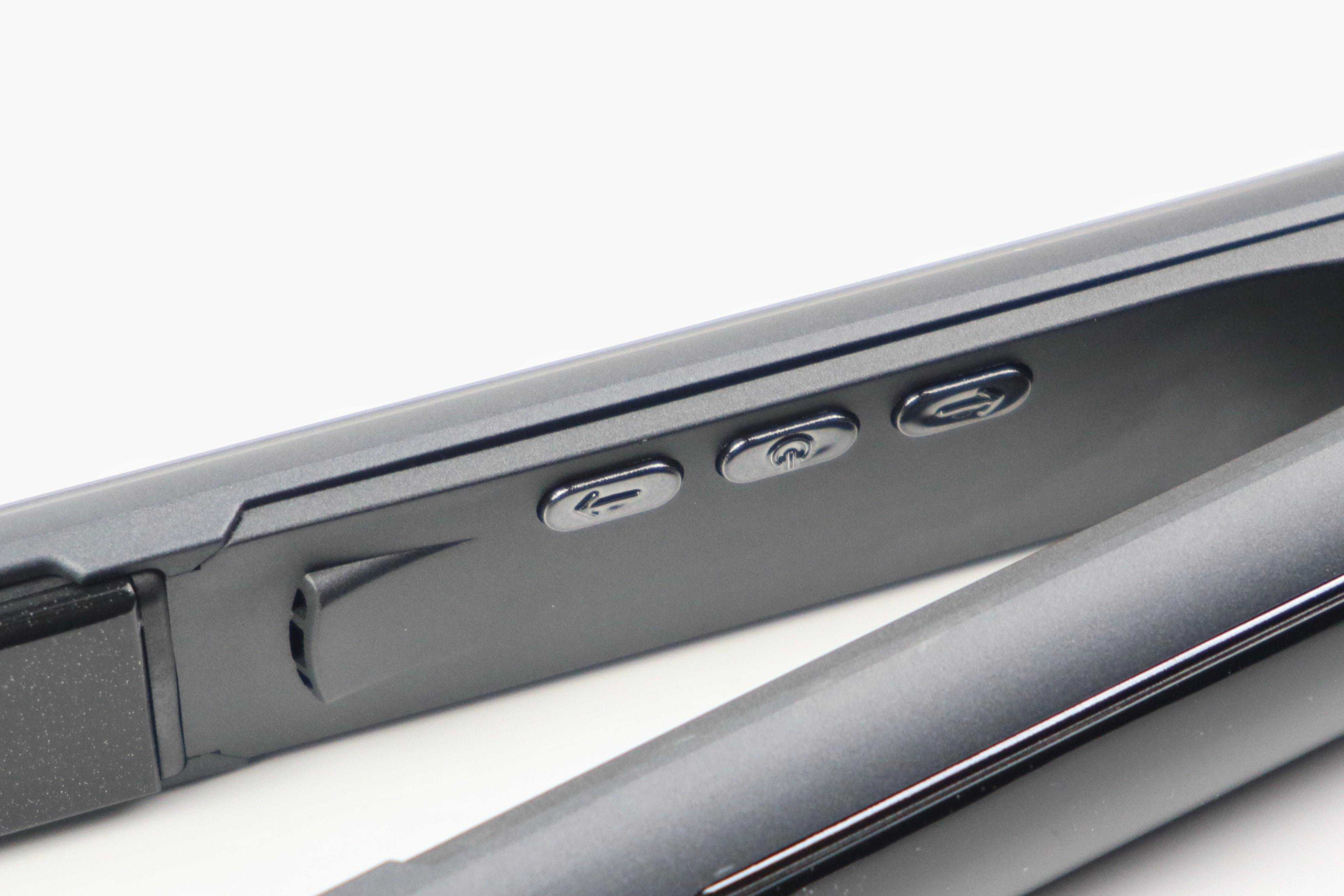 发热板往内是负离子发射口,此外还有三个实体按键能够实现开机和调温:点按电源键开机、点按上下调温键调节温度、长按电源键关机。不过按键位置设计在双夹板内侧,位置的选择稍稍让人有点疑惑。