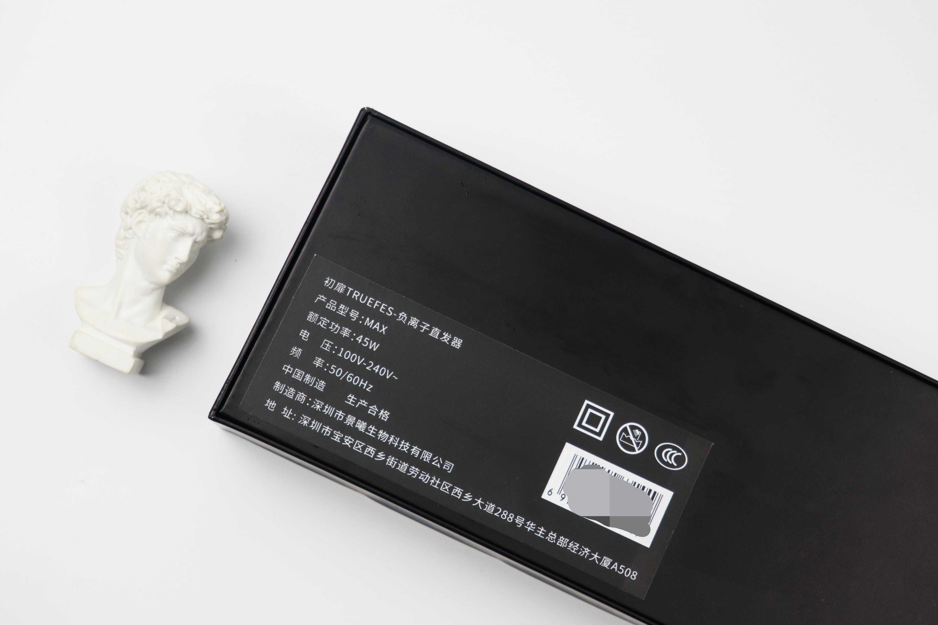 产品包装采用纯黑色纸盒,正面印有产品的外形简图、品牌logo和产品型号,而侧面能够看到其slogan:以养肤标准养发。