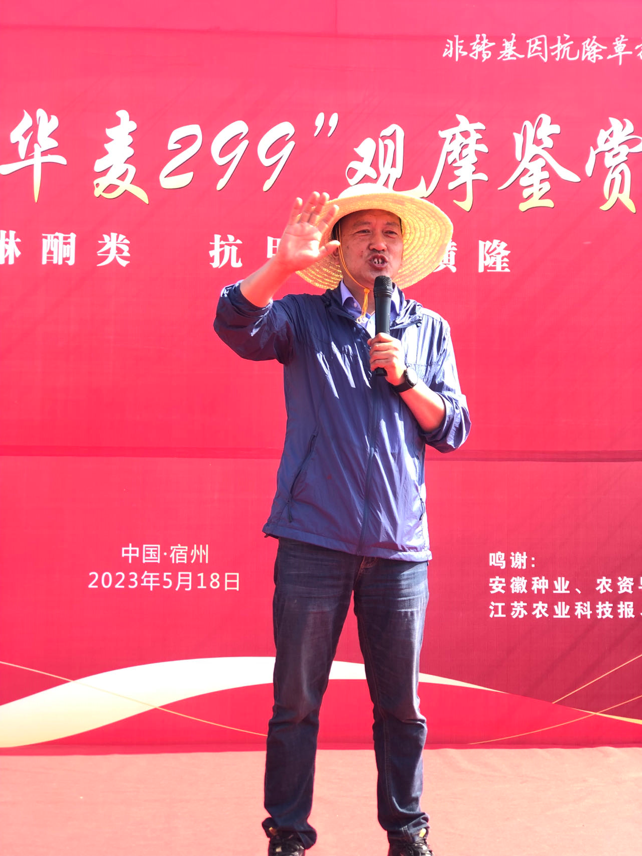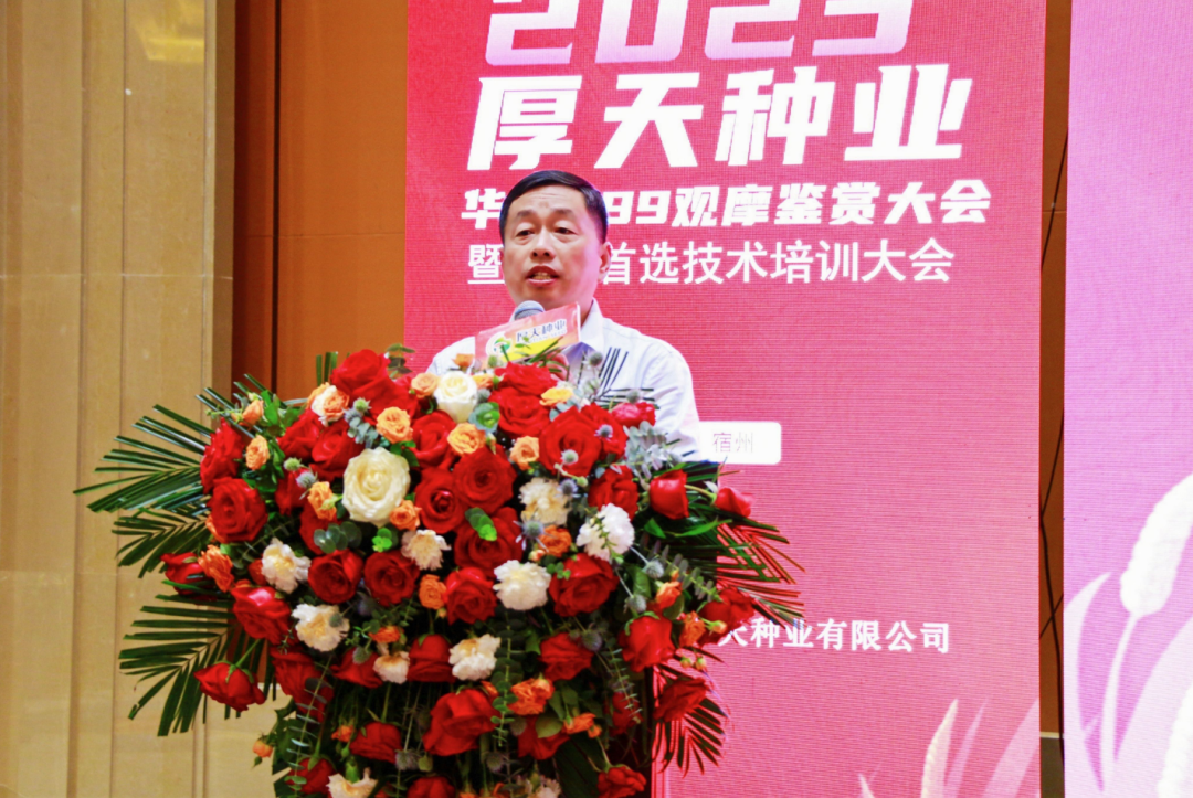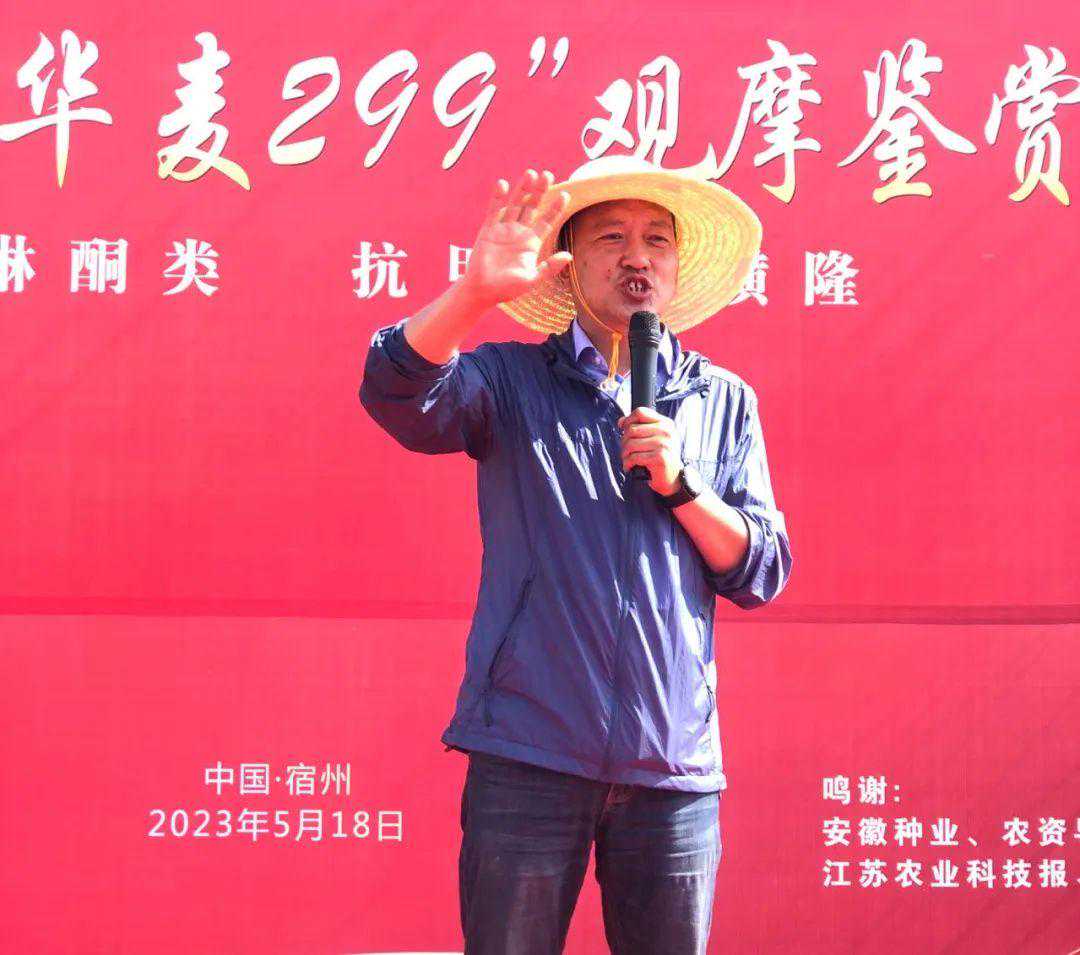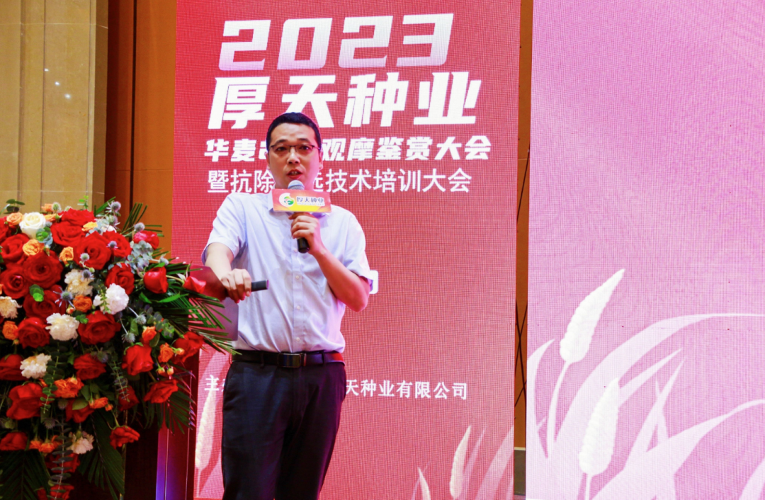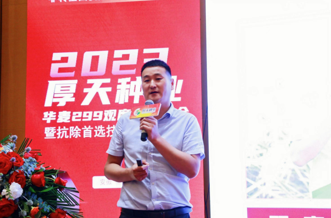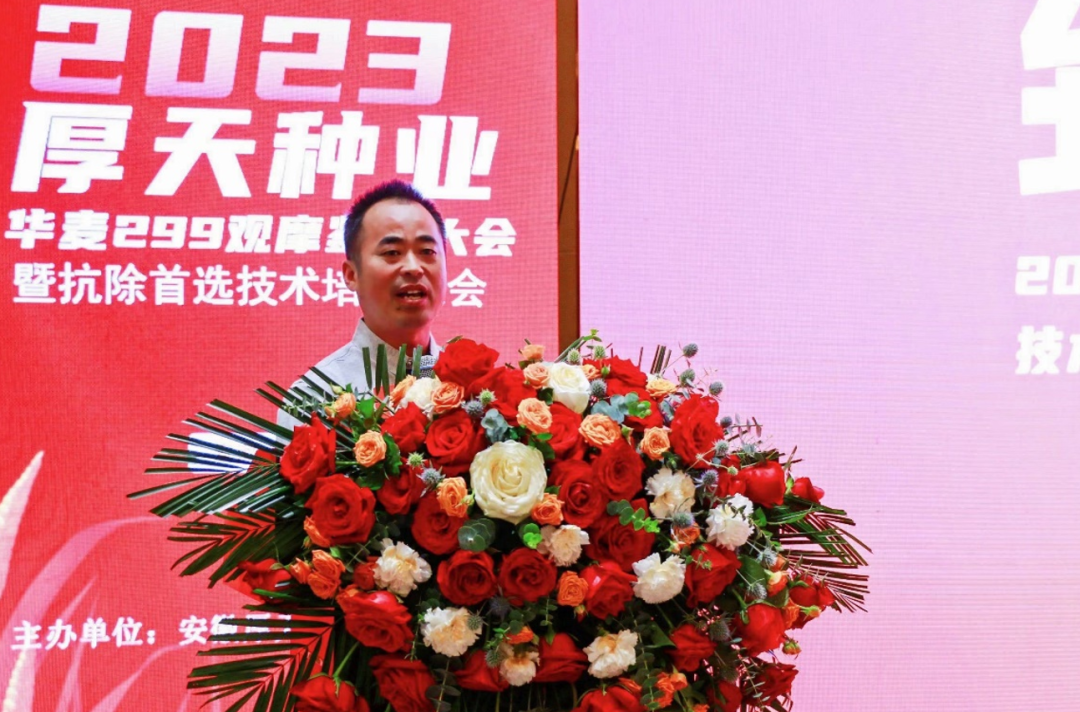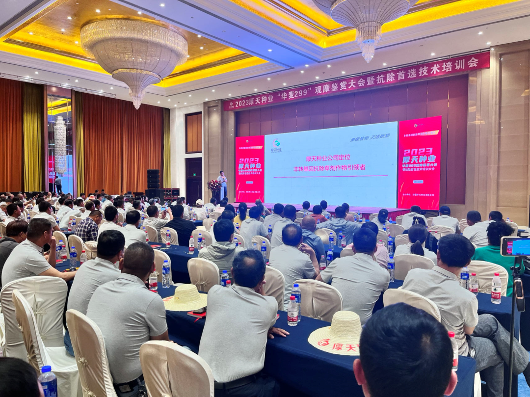 农家少闲月,五月人倍忙。五月正值小麦丰收的时节,也是见证新产品、新技术的时刻。5月19日,由安徽厚天种业有限公司(下称厚天种业)主办的2023厚天种业“华麦299”观摩鉴赏大会暨抗除首选技术培训会在安徽宿州顺利召开。会议针对“华麦299”这一小麦品种的独特优势、种植要点、管理技术以及用药方式进行田间观摩和室内交流,农技专家、企业领导、行业媒体、各地区代理商、经销商以及种植户300余人参加此次会议。