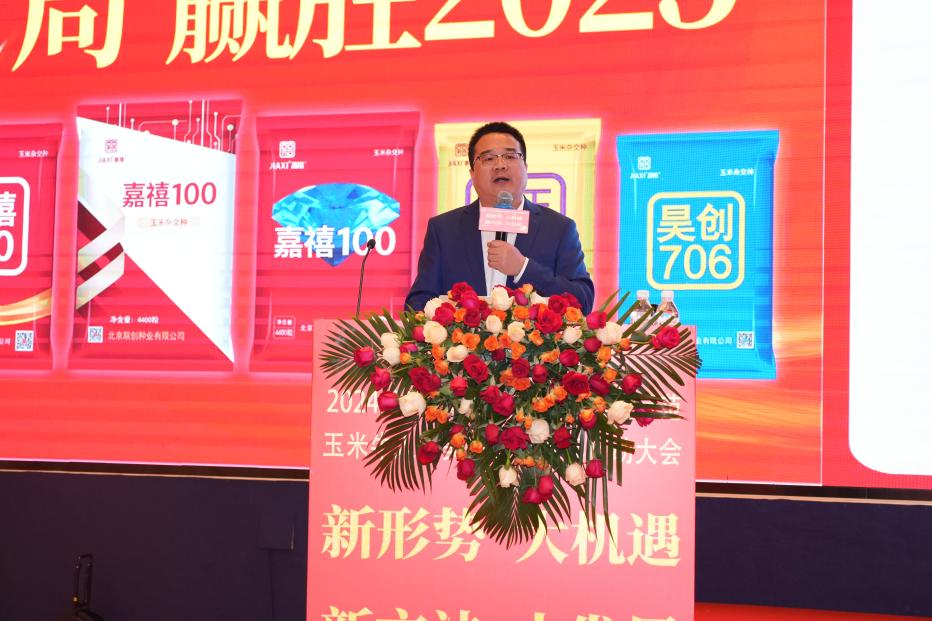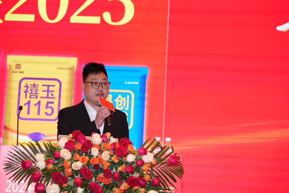 张伟作《以始为终决胜布局向着更高的目标持续奋斗》的主题报告,他就嘉禧品牌从小到大、快速发展的历程进行了详细讲述。他表示,2023—2024年度是嘉禧品牌快速发展的关键年度,嘉禧100,焕“芯”升级;禧玉115,横空出世;德美2号,应运而生;品种矩阵已经形成。通过践行SAVE营销,以科技示范为基础,玉米牛人最美粮王选拔赛为主线,认真执行各项营销举措,嘉禧100、禧玉115、德美2号等品种发货数量远超往年。