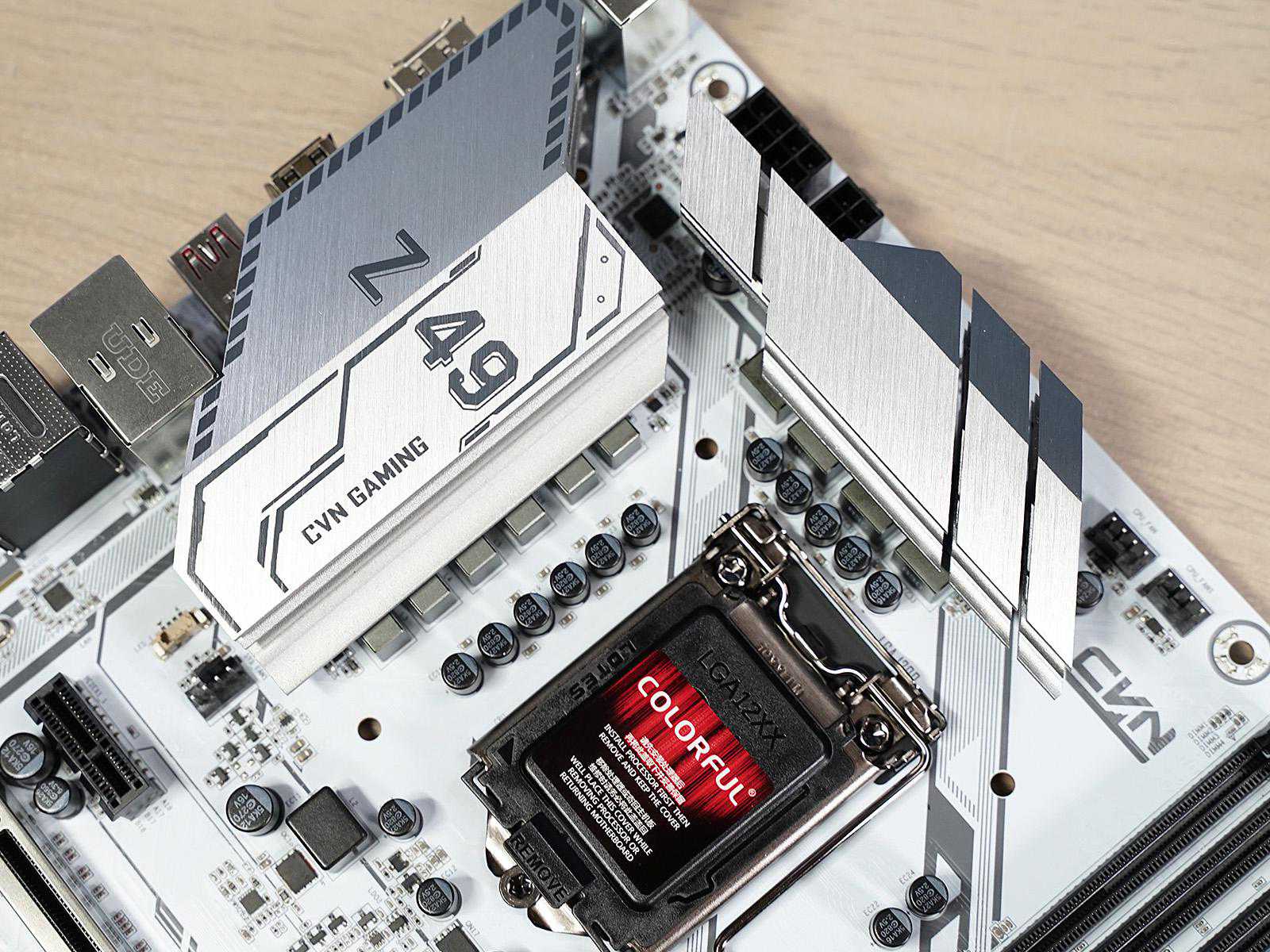CPU辅助供电接口为8+4Pin设计,供电区域上方和左侧各有1块大体积的铝制散热块,左侧散热块上有Z49和CVNGAMING的标记。