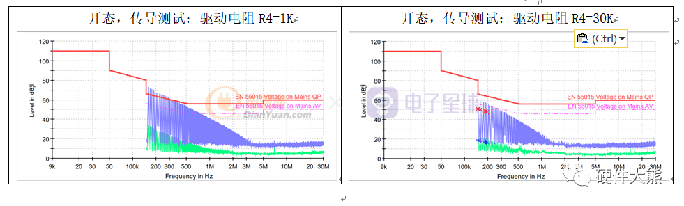 此GATE为低频开关信号,驱动电阻R4建议选取20~30K,让MOSFET开启更缓。若R4不够大或MOSFET的结电容偏小,EMI会比较差,可根据EMI情况调整。下图为驱动电阻R4电路图示以及不同驱动电阻R4阻值传导测试对比结果: