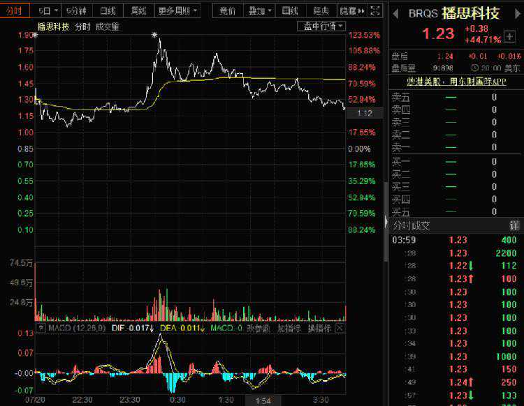 北京时间7月21日消息,隔夜美股三大指数全体收涨,中概股方面,播思科技领涨,截至收盘,播思科技涨44.71%,报1.23美元,盘中,播思科技最大涨幅达到123.53%。而在3月12日和4月13日,播思科技盘中分别有飙涨超300%、近500%的表现,这两个交易日,播思科技最后的涨幅分别为125.56%和220.80%。