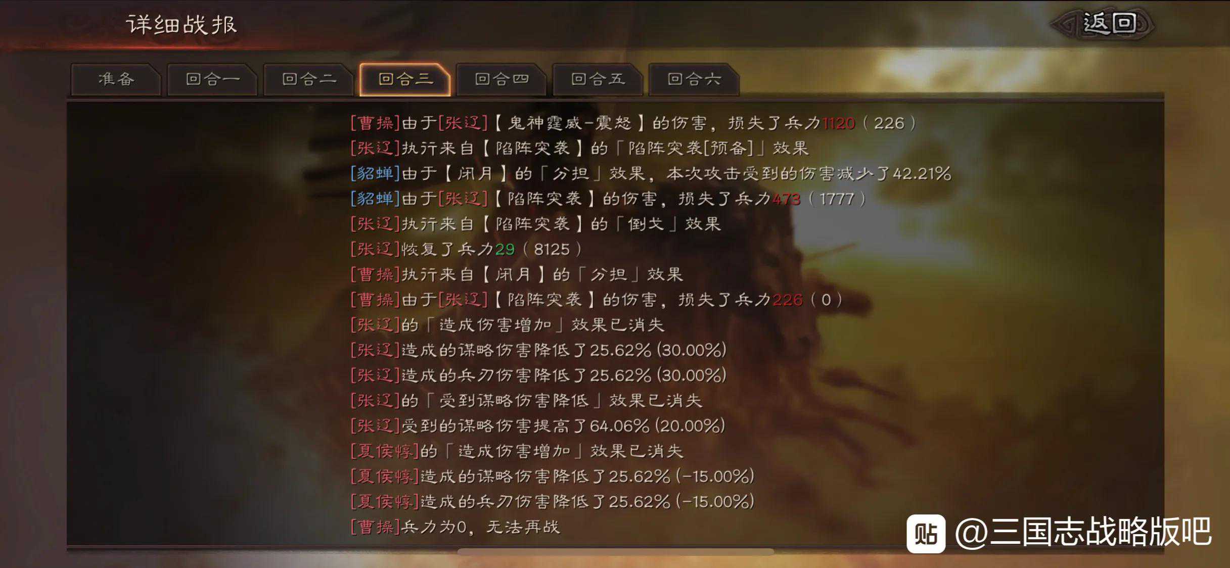 貂蝉闭月到曹操(曹操各种兵刃减伤达到约90%的兵刃减伤),准备回合90%兵刃减伤的曹操被自己物理队三回合内打死。
