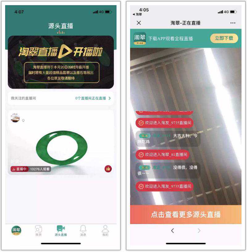 淘翠APP是以“多商家+创建订单购物”为特色模式的一站式珠宝翡翠直播购物平台,强力打造源头直播与买手栏目,带领用户深入珠宝玉石产地源头,挑选高质量的珠宝,通过直播的方式展现在用户面前,并引入深谙翡翠市场、拥有专业水准的买手提供找货服务,实现了精准的钱货对接与买卖双方的一对一交流及翡翠知识科普,让大家选购到货真价实的天然A货翡翠。