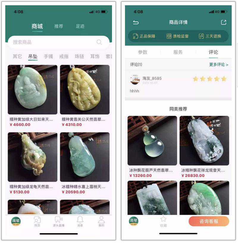 APP要求以高清真实的产品直播及简洁流畅的商城界面,呈现人、货、场三者互相交融并重的翡翠购物新模式,抛去中间利润,带给用户最透明合理的回馈及最佳的消费体验。