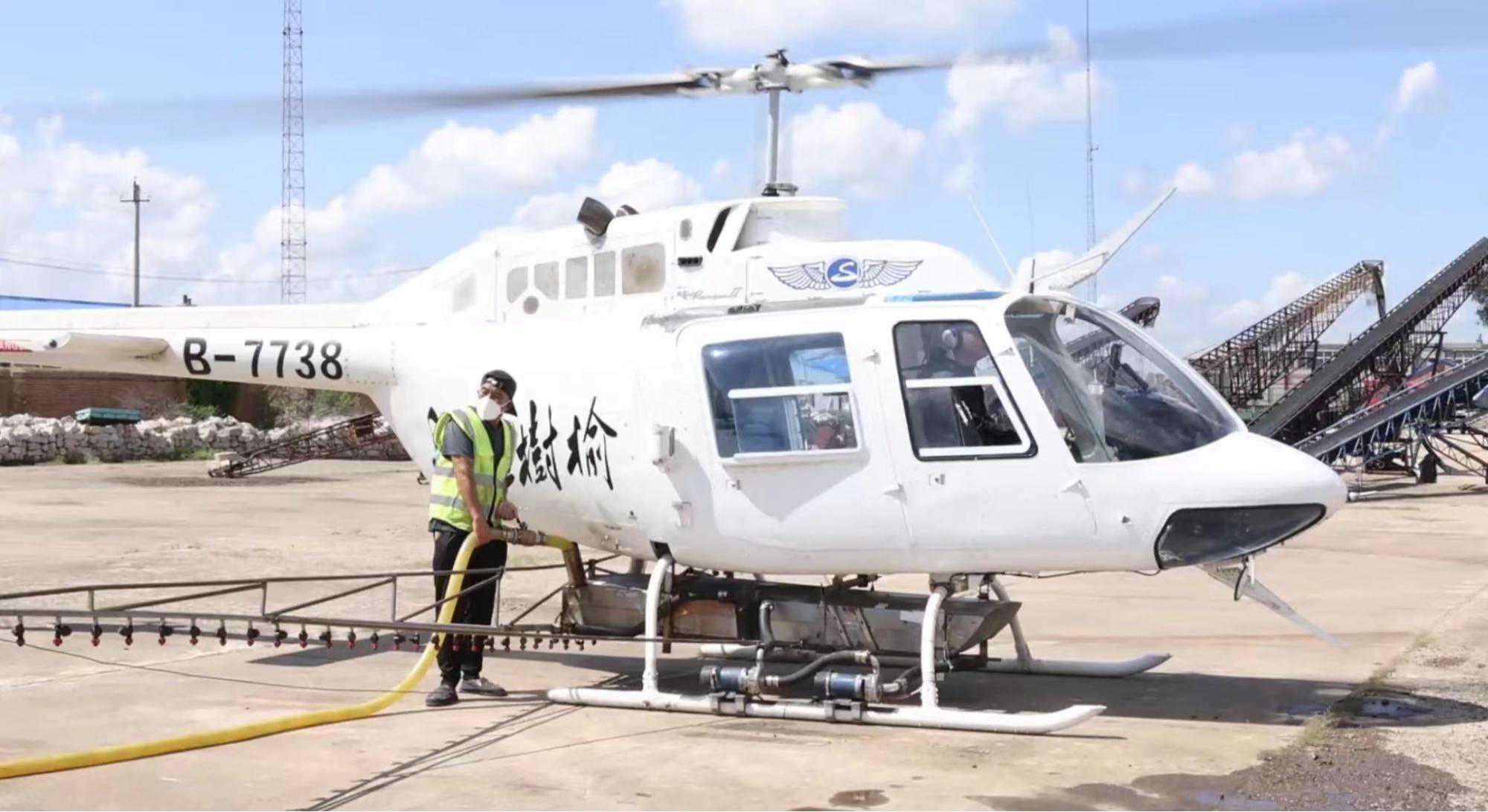 技术人员正在给直升机加注药剂(央广网发周林海摄)