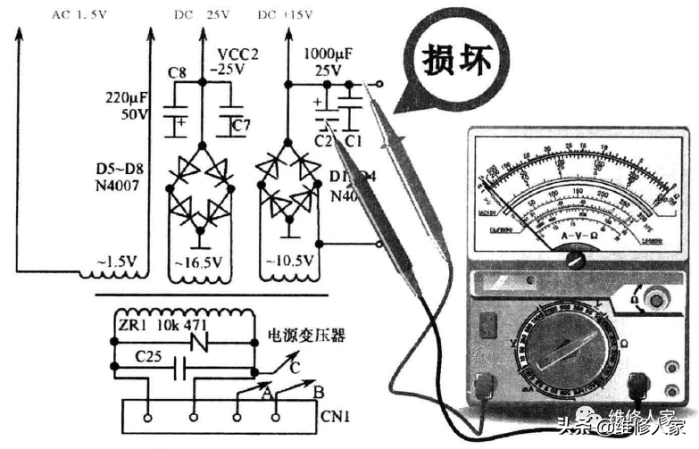 此时,即有可能是谐振晶体损坏,也有可能是微处理器内部的谐振电路损坏。区分方法是可以使用万用表检测谐振晶体引脚的电压,正常时应分别为2.4V和0.6V左右,如下图所示。
