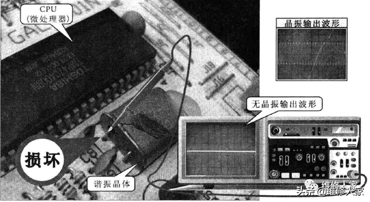 当使用示波器检测CPU(微处理器)晶振电路的时候,发现检测不到晶振电路波形,如下图所示。