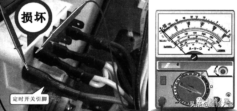 检测机械控制装置各引脚之间的阻值,结果发现定时开关的两个引脚间的阻值较大(应接近0),如下图所示,由此可以判断定时开关损坏。