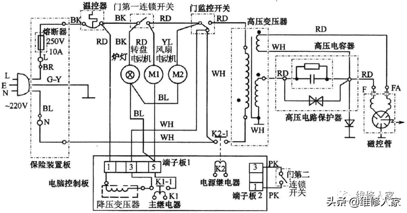 由于能够听到“吱吱"的打火声,说明电源220V已经输入到微波炉内部,此时,怀疑是微波炉的门开关或控制装置有故障。下图所示为该微波炉电路图。