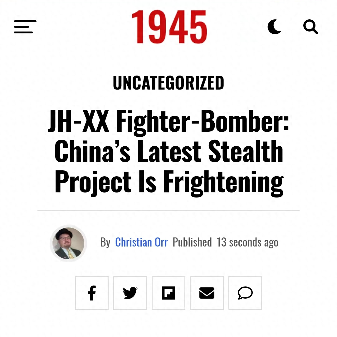 美媒:歼轰-XX令美国感到恐惧,将在区域拒止战略中起到重要作用在《JH-XXFighter-Bomber:China’sLatestStealthProjectIsFrightening》一文中,1945军事编辑克里斯蒂安·奥尔表示:在歼-20隐身战斗机与轰-20隐身战斗轰炸机之后,中国空军的下一步将是,定位介于歼-20与轰-20之间的歼轰-XX隐身战斗轰炸机。