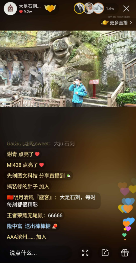 为了让更多老铁看到大足石刻,快手针对重庆、四川、贵州、陕西等省份安排了同城页置顶推荐,联合“封面新闻”、“重庆卫视”、“快手旅行”、“快手正能量”进行转播。两天内的三场直播分别为“云游大足石刻博物馆”、“大足石刻——石壁上的博物馆”、“云游大足石刻”之“魔幻北山”,全网总观看人次1070.7万,快手老铁为大足石刻送出412.5万个点赞。