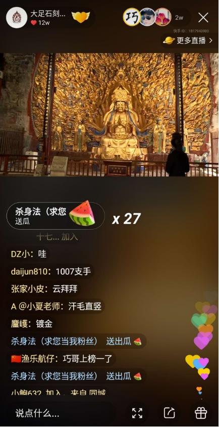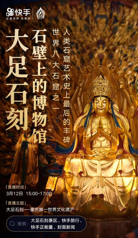 其实,疫情并未阻断人们与大足石刻的联系。3月11日至12日,越来越多人发现,大足石刻景区(ID:1817943900)正在快手直播。在景区讲解员、主持人和大足石刻研究院副院长的引导下,重庆市民得以通过快手直播重回每年都要去拜一拜的石窟、寺庙;全国各地的网友也在这个无法旅游的特殊时期,有机会瞻仰大足石刻这座闻名世界的历史遗迹。