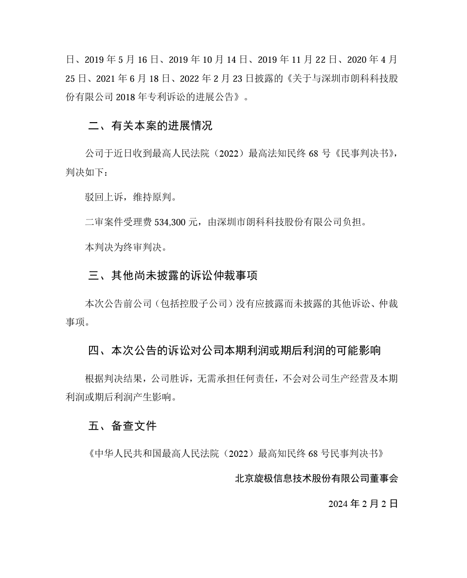2021年6月,旋极信息收到深圳中院作出的(2018)粤03民初1661号《民事判决书》,判决驳回原告朗科科技诉讼请求;本案案件受理费人民币534300元,司法审计费人民币100000元,鉴定费人民币356612元,由原告朗科科技负担。