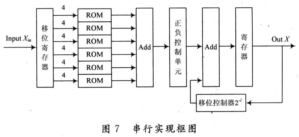 对于串行分布式算法结构滤波器,LUT输出值与寄存器值左移1位(乘以21)后的数值相加,并将相加后的结果存入寄存器。首先计算高位(b=0),再计算低位,所以寄存器的值要先左移1位再相加,从而减少资源消耗。当b=0时,做减法运算;当b0时,做加法运算。经过1次减法和B-1次加法,在B次查询循环后完成计算,实现框图如图7所示。