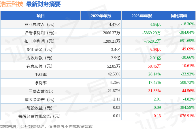 据证券之星公开数据整理,近期浩云科技(300448)发布2023年年报。根据财报显示,本报告期中浩云科技净利润减384.04%,三费占比上升明显。截至本报告期末,公司营业总收入3.65亿元,同比下降18.36%,归母净利润-5869.29万元,同比下降384.04%。按单季度数据看,第四季度营业总收入9115.41万元,同比下降43.82%,第四季度归母净利润-4082.01万元,同比下降545.07%。