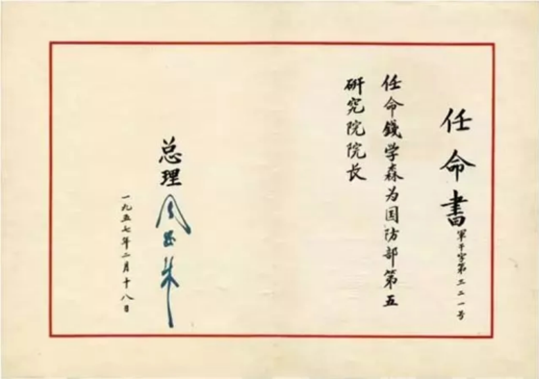 随后,负责火箭、航天科学研究的机构国防部第五研究院成立。周恩来总理亲自签署任命书,任命钱学森担任国防部第五研究院首任院长。