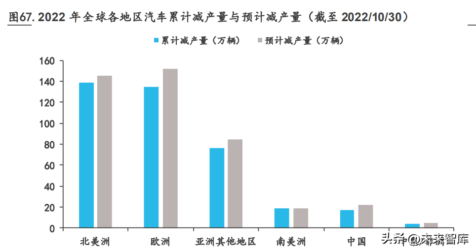 2021年1月至2022年10月底缺芯导致全球汽车减产共1410万辆,预测2023年供给紧缺持续,减产将超300万辆。根据2021年AFS统计报告,由于芯片短缺,2021年全球汽车市场累计减产量约为1020万辆。主要地区中,北美洲减产317.8万辆,欧洲减产295.4万辆,中国减产198.2万辆,亚洲其他地区减产174万辆,南美洲减产35.5万辆,中东/非洲合计减产6.2万辆。其中,亚洲是2021年汽车减产最严重的地区,合计减产超360万辆。针对2022年,AFS曾经预计将减产76.77万辆,其中北美洲预计减产17.43万辆,欧洲预计减产28.08万辆,中国减产10.82万辆,亚洲其他地区减产16.3万辆,南美洲减产3.14万辆,中东和非洲预计减产1万辆。并且2022年汽车产业“缺芯”情况尚未转好,截至2022年10月30日,全球因为缺芯已导致汽车产量缩减约390.5万辆。其中,欧洲地区遭受了巨大的冲击,减产135.14万辆汽车;北美地区减产138.65万辆汽车;亚洲其他地区减产76.46万辆汽车;中国地区减产17.29万辆汽车。AFS预计到2022年底,全球累计减产量将达427.8万辆,相较9月预估增加1.62万辆;2023年减产量或超300万辆。