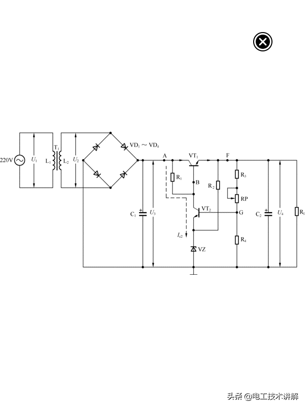 U4电压在供给负载的同时,还经R3、RP、R4分压为比较管VT2提供基极电压,VT2有电流Ib2从基极流向发射极,VT2导通,马上有店里Ic2流过VT2,电流Ic2的途径是:A点-R1-VT2的集-射极-VZ-地。