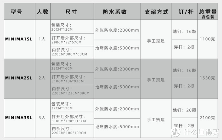 MINIMA设计轻量、防风防雨,外帐采用30D尼龙66格面料,轻薄细腻,具有超强的拒水性,防水指数2000mm,内帐采用40D涤花网纱,防蚊防虫,舒适透气,底帐防水指数达5000mm,有单人、双人、三人三种规格,单人重量1.1kg,双人15.3kg,三人2.1kg。