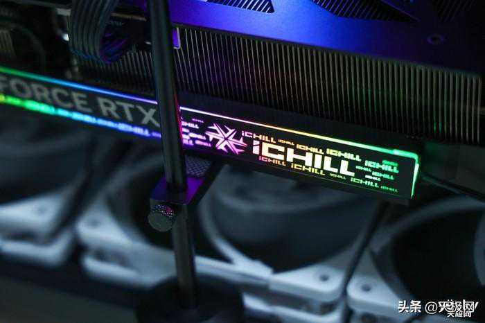 来到显卡背面,RTX4080冰龙超级版同样采用全尺寸金属背板,起到加固和保护PCB版的作用,靠近核心的位置印有独特的三角形纹路与“iCHILL”和“GEFORCERTX”字样,向尾部延伸的散热鳍片一端大面积镂空,以求减少尾部重量并兼顾最佳散热风道。