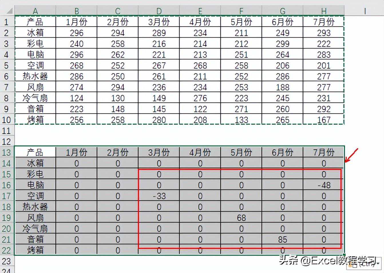 可以看到这时下表的数据发生了很大变动,是因为我们通过选择性粘贴,将上表数据减去下表数据而得到的结果值。