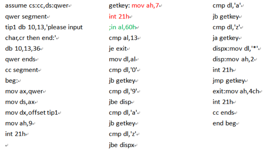 图2是一个利用键盘和屏幕进行输入输出的汇编程序,其结果是从键盘输入数字的时候屏幕照样显示数字,输入其他字符的时候则显示‘*’号,输入回车键结束。运行结果如图3所示。程序中分别调用了