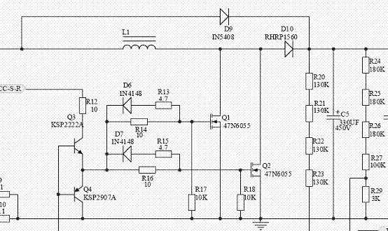 图3-1所示;是三星V2屏等离子开关电源的PFC激励部分。从图中可以看出;这是一个并联开关电源L1是储能电感,D10是这个开关电源的整流二极管,Q1、Q2是开关管,为了保证PFC开关电源有足够的功率输出,采用了两只MOS管Q1、Q2并联应用(图3-2所示;是该并联开关电源等效电路图,图中可以看出该并联开关电源是加在整流桥堆和滤波电容C5之间的),图中Q3、Q4是灌流激励管,Q3、Q4的基极输入开关激励信号,VCC-S-R是Q3、Q4的VCC供电(22.5V)。两只开关管Q1、Q2的栅极分别有各自的充电限流电阻和放电二极管,R16是Q2的在激烈信号为正半周时的对Q2栅极等效电容充电的限流电阻,D7是Q2在激烈信号为负半周时的Q2栅极等效电容放电的放电二极管,同样R14、D6则是Q1的充电限流电阻和放电的放电二极管。R17和R18是Q1和Q2的关机栅极电荷泄放电阻。D9是开机瞬间浪涌电流分流二极管。