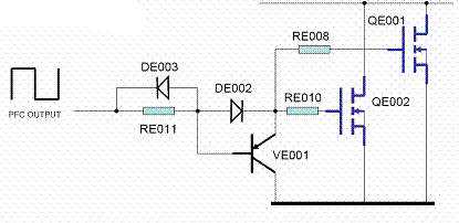 从等效电路图来分析,集成电路的激励输出端(PFCOUTPUT端子),输出方波的正半周时DE002导通,经过RE008、RE010对MOS开关管QE001和QE002的栅极充电,当激励端为负半周时,DE002截止,由于晶体三极管VE001是PNP型,负半周信号致使VE001导通,此时;QE001和QE002的栅极所充电荷经过VE001放电,MOS管完成“开”、“关”周期的工作。从图3-5的分析中,RE011作用是充电的限流电阻,而在放电时由于VE001的存在和导通,已经建立了放电的回路,DE003的作用是加速VE001的导通,开关管关闭更加迅速。