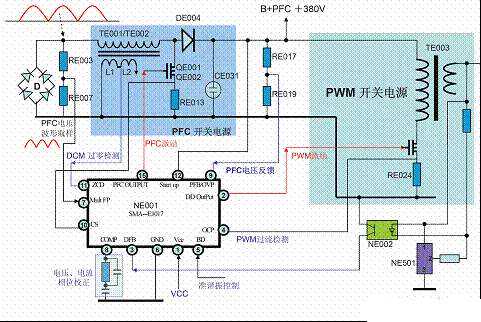 图3-4所示原理图是PFC开关电源及PWM开关电源的电原理图,该电路中的集成电路MSA-E1017是把PFC部分的激励控制和PWM部分激励控制复合在一块集成电路中,图3-6是原理框图,图中的QE003及TE002是PWM开关电源的开关管及开关变压器,RE050是QE003的充电限流电阻、DE020是其放电二极管。