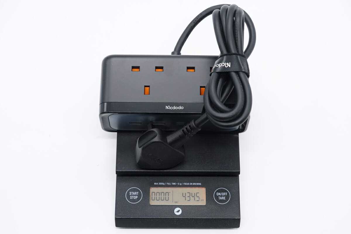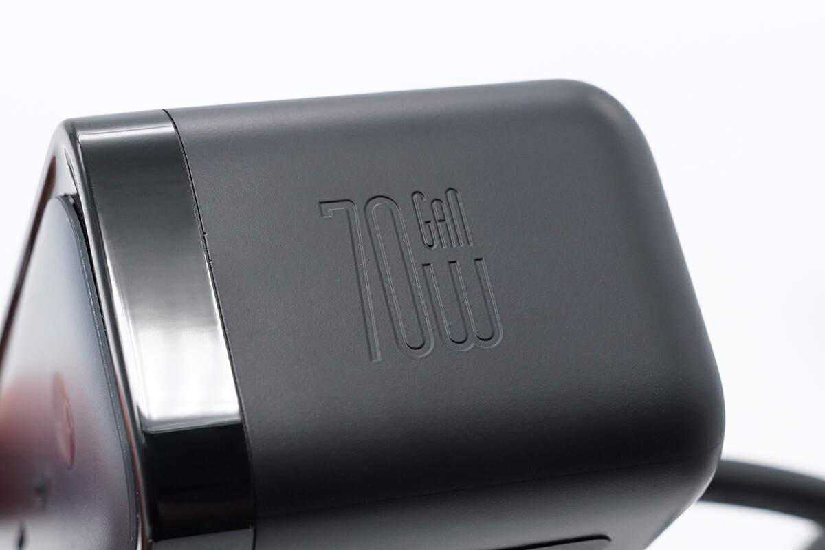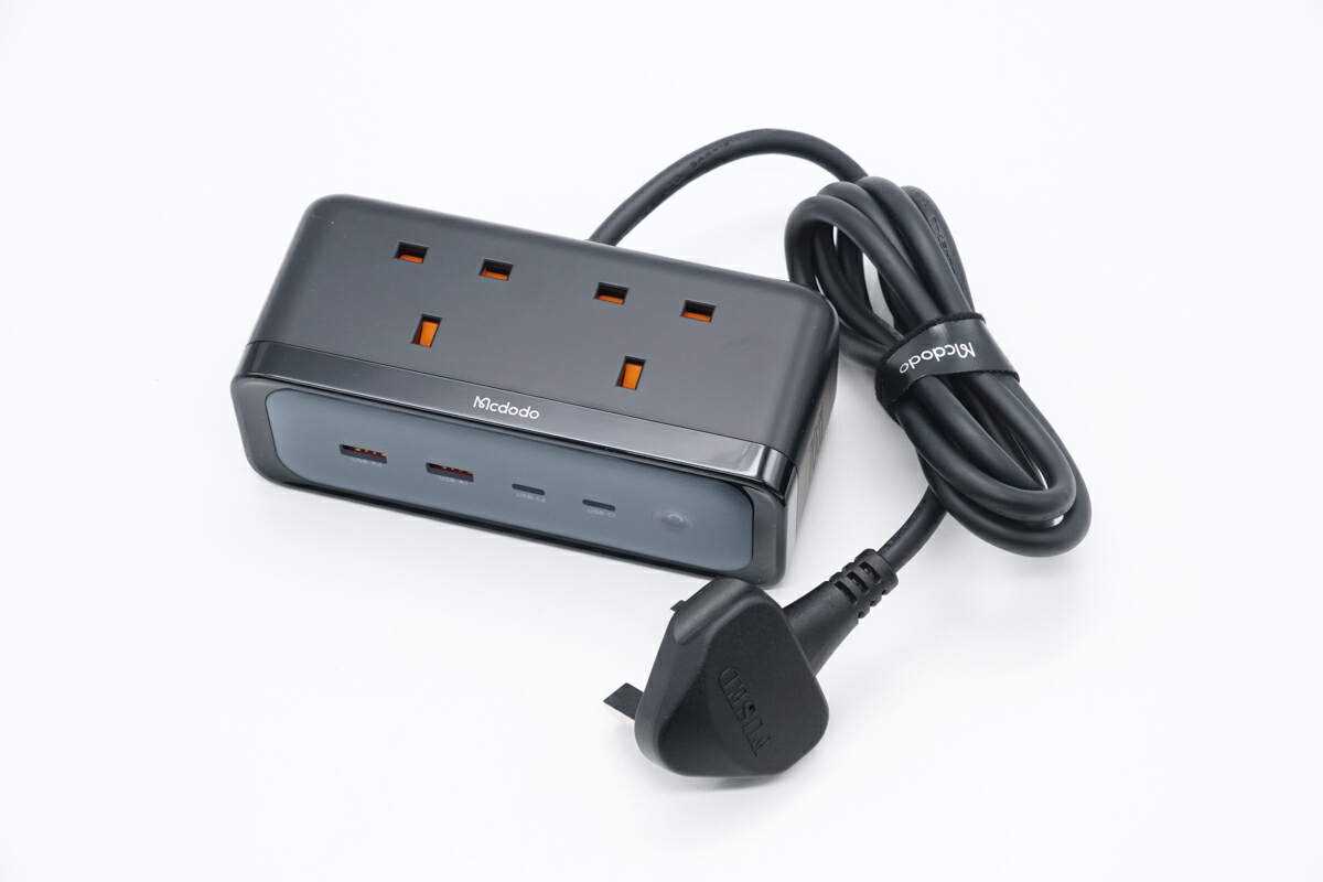 麦多多70W六合一氮化镓快充插座自带三脚插头电源线,机身外壳为前后拼接结构,表面做了亮面和磨砂撞色处理。