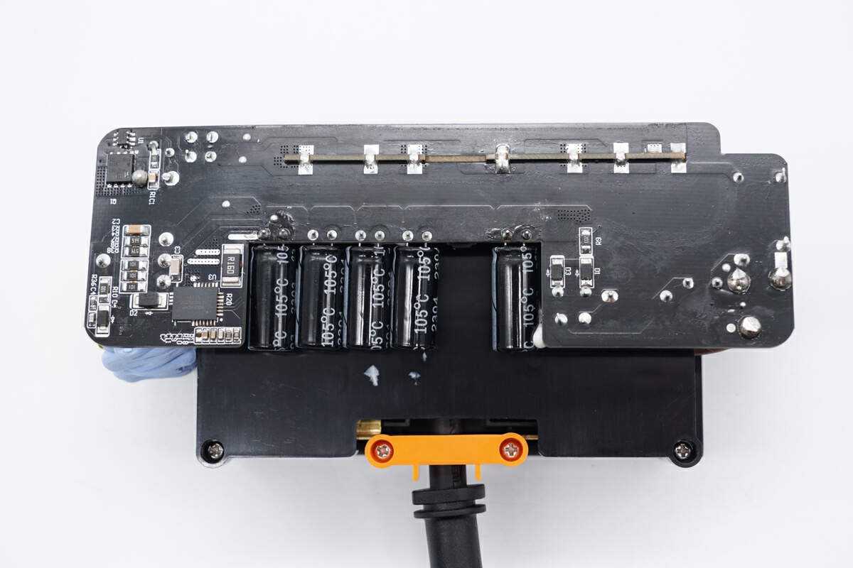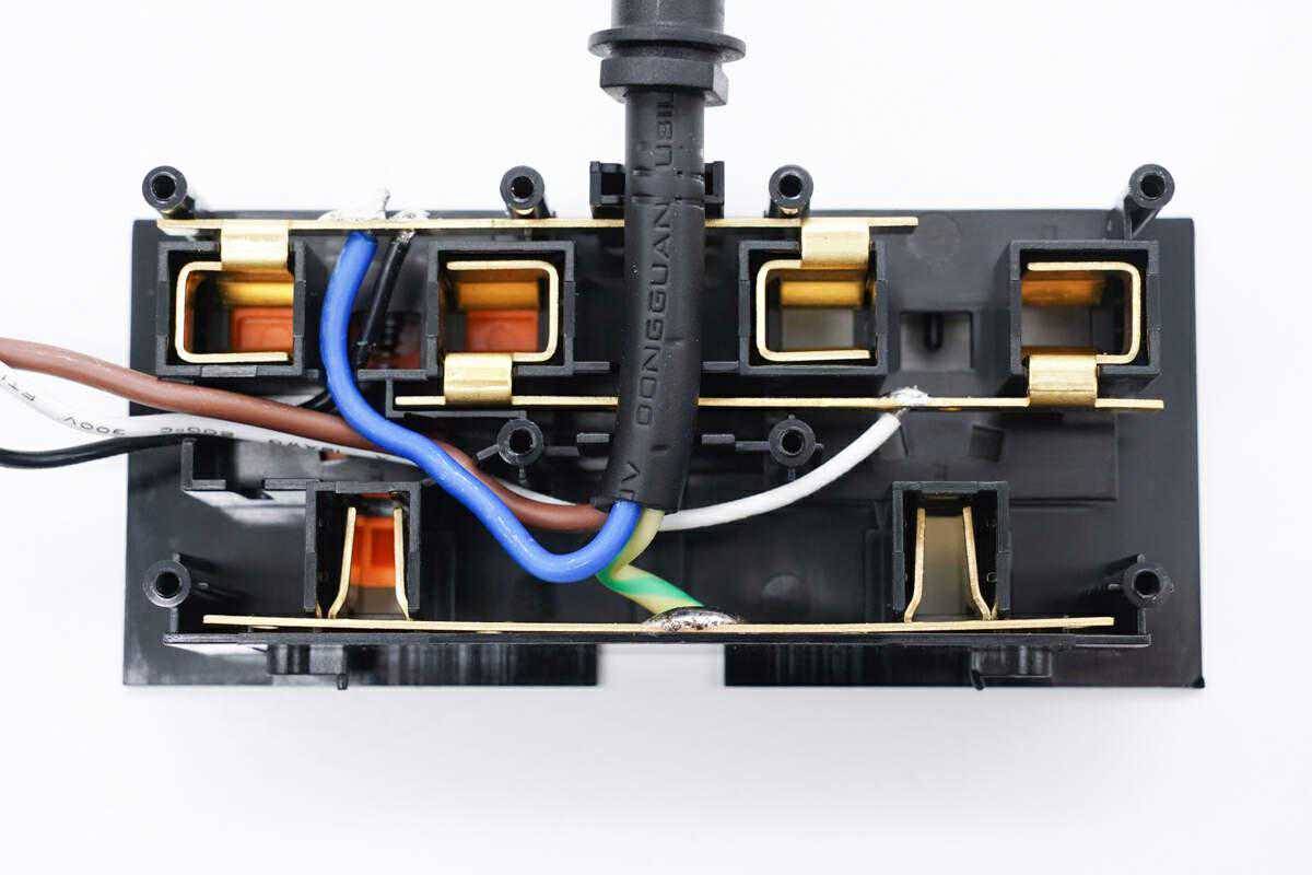 降压输出采用英集芯IP2738U和IP2726协议芯片,搭配三颗拓尔微TMI3351同步降压转换器实现四口快充输出,同步整流管和VBUS开关管均来自芯控源。内部采用固态电容进行滤波,输出更加稳定。插座模块采用一体铜条设计,与导线通过焊接连接,内部设计和用料扎实可靠。