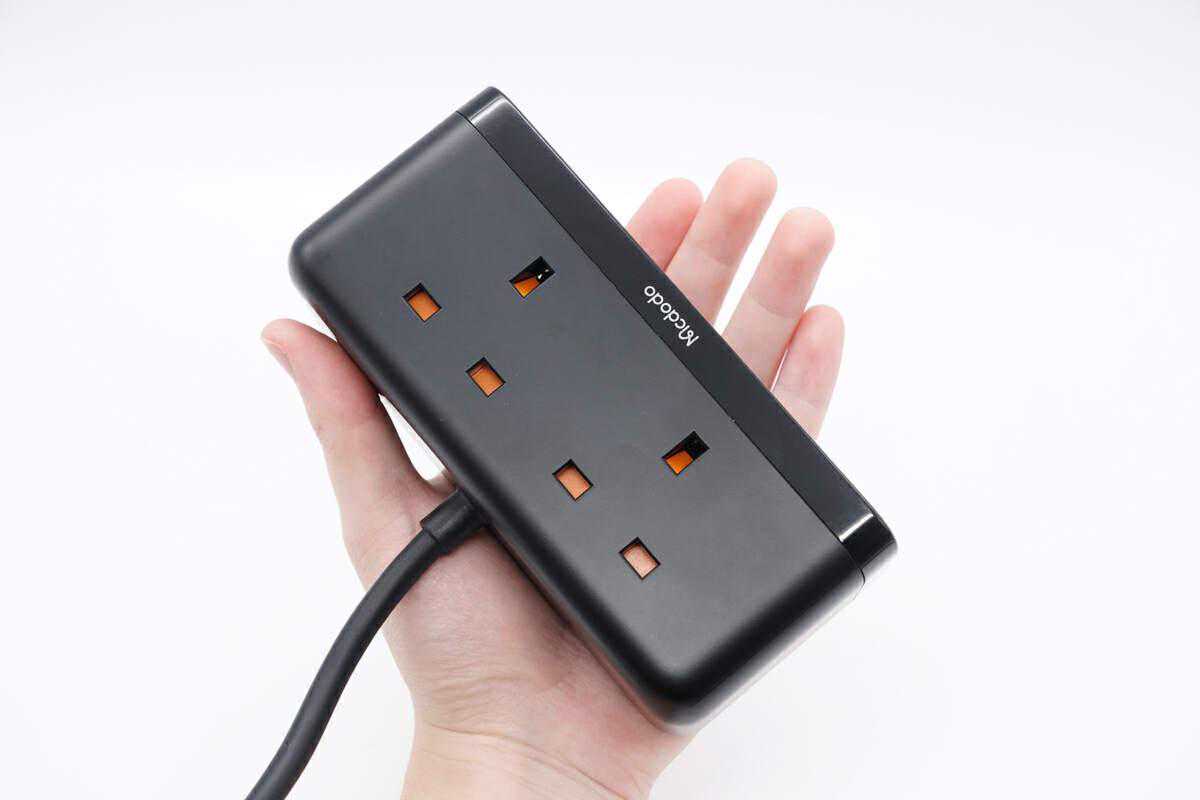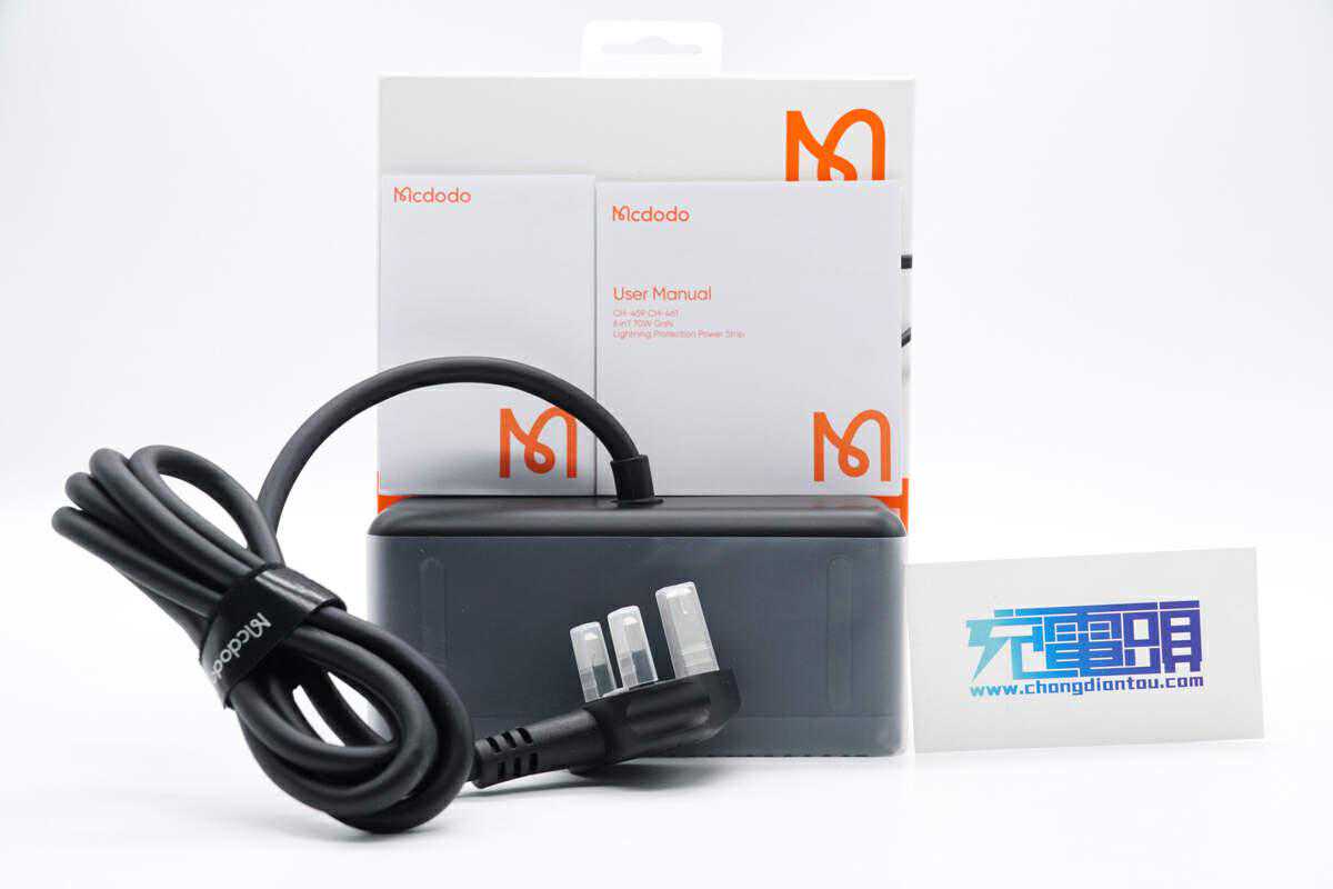 机身顶面配置两组英规三脚插口,透过插孔可见内部橙色安全门,可防止异物单孔插入,避免触电风险。顶面边缘印有Mcdodo品牌。