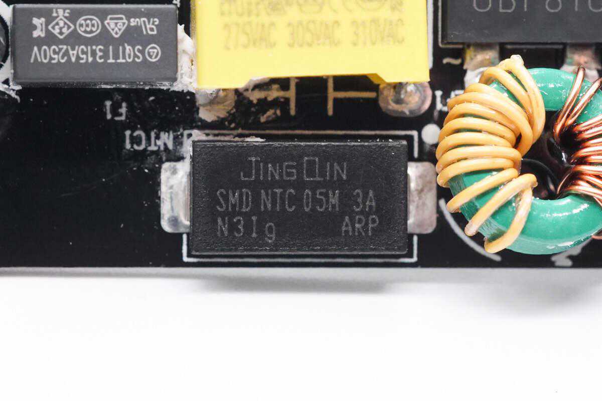 输入端NTC热敏电阻来自精勤元件,型号SMDNTC05M3A,为贴片型热敏电阻,用于抑制浪涌电流。规格为5Ω,最大稳态电流3A。