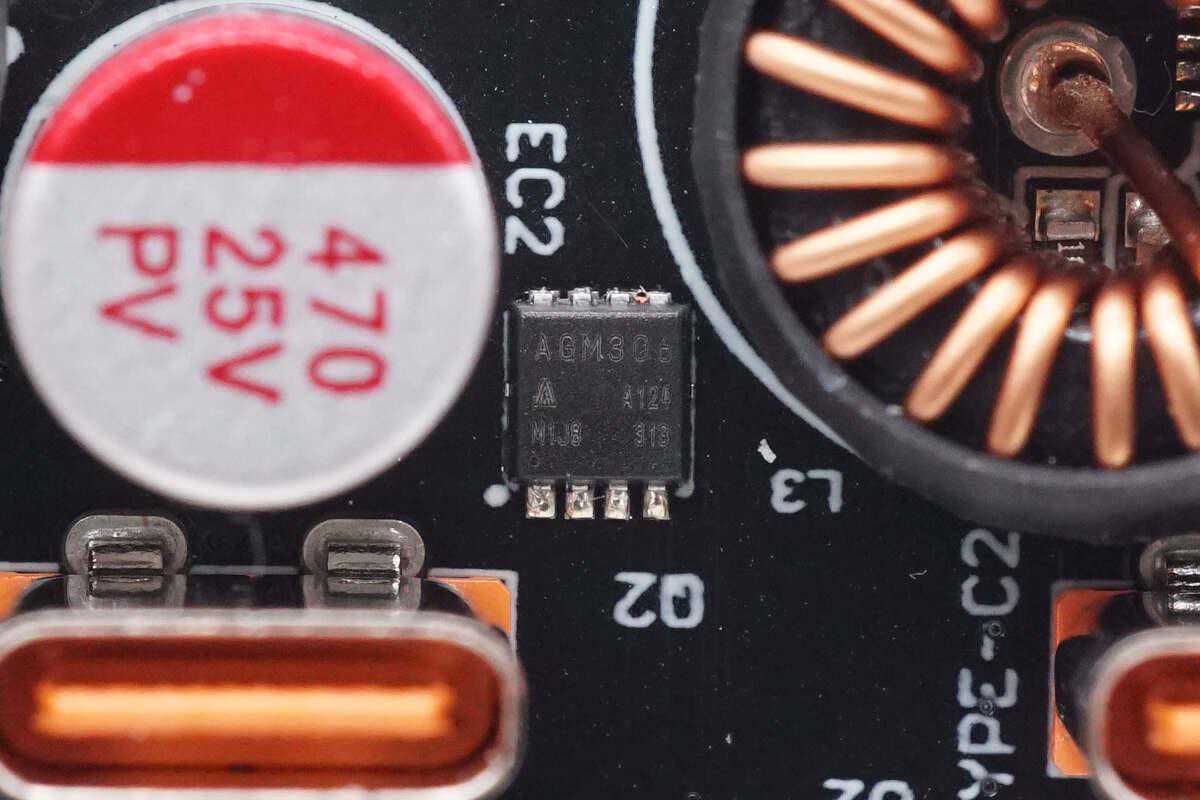 USB-C接口的VBUS开关管来自芯控源,型号AGM306AP,NMOS,耐压30V,导阻5.8mΩ,采用*3.3封装。