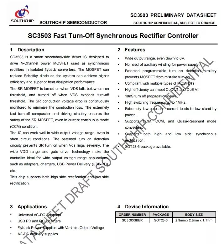 同步整流控制器来自南芯科技,型号SC3503,是一颗自适应开通检测和快速关断同步整流控制器,无需辅助线圈供电,输出电压最低可低至0V,专利的自适应开通检测电路避免同步整流管误开通,兼容多种MOS,具有超低的静态电流,支持多种工作模式,支持高侧和低侧同步整流,外围元件非常精简。