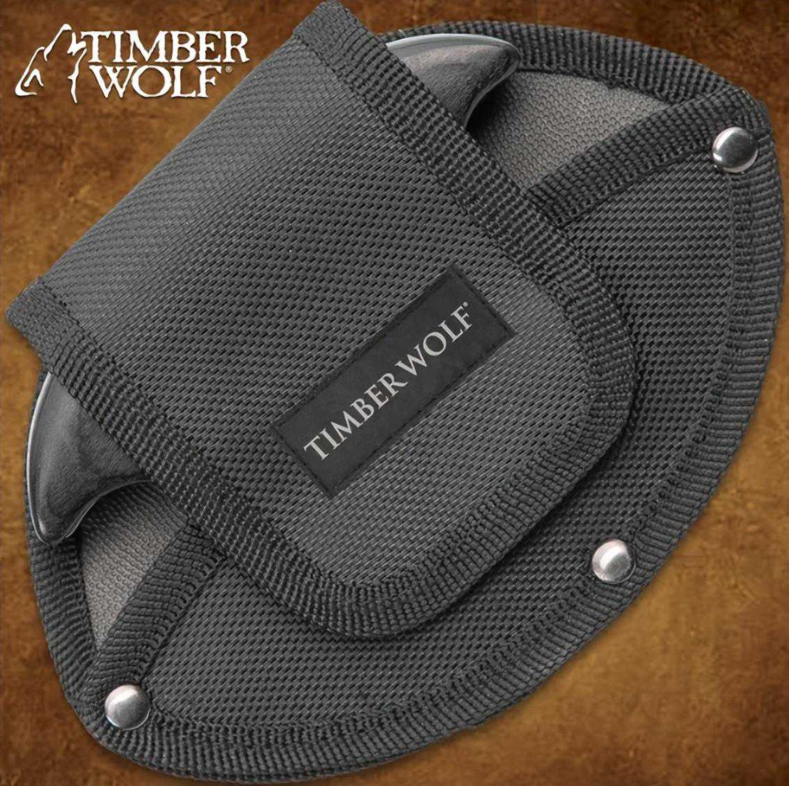 这把刀采用了一体式结构,刀体与手柄间隔处都设计有可以用来容纳手指的指槽设计,以便于使用者稳定持握。手柄的柄材采用了深色和浅色两种颜色的合成木材制造而成,手柄与刀体相连接达的地方采用铜钉进行锚固,使用者用不着担心这把刀会出现柄材脱落的情况。这把特殊的户外刀还配备有黑色尼龙护套来收纳刀刃,护套上还有挂环可以将其穿挂在腰带上携带出行。
