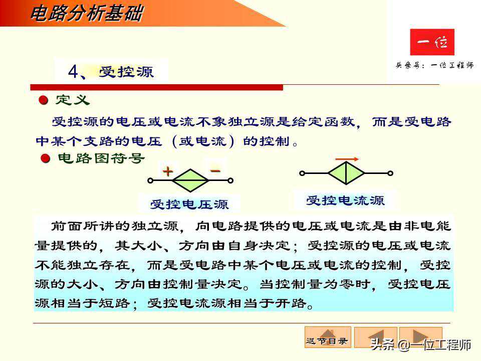 电阻元件:只具耗能的电特性。电感元件:只具有储存磁能的电特性。电容元件:只具有储存电能的电特性。理想电压源:输出电压恒定,输出电流由它和负载共同决定。理想电流源:输出电流恒定,两端电压由它和负载共同决定。