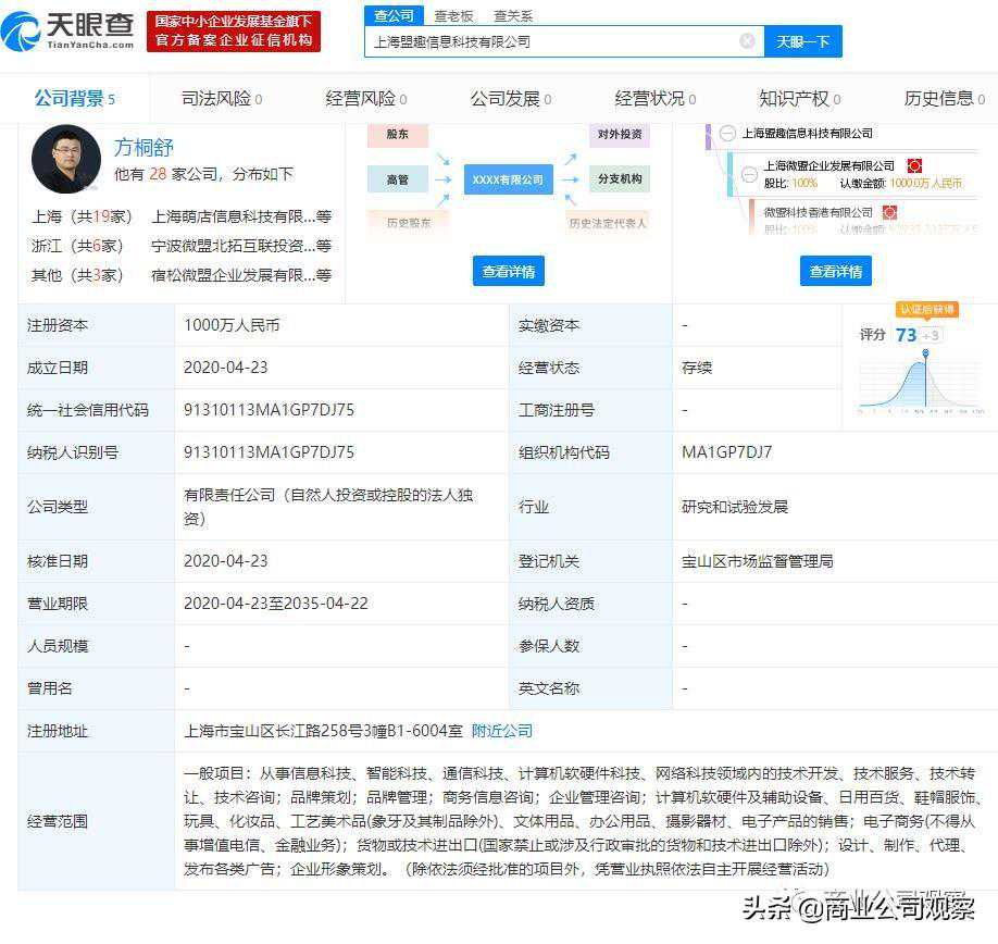 天眼查信息显示,香港主板上市企业微盟(上海微盟企业发展有限公司)日前设立子公司上海盟趣信息科技有限公司,新公司注册资本1000万,法定代表人方桐舒。