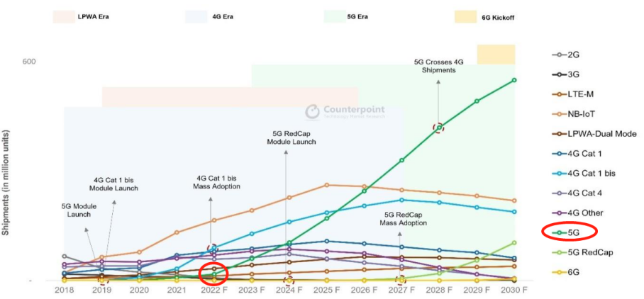 根据Counterpoint的预测,2022-2030年5G模组累计出货量将达到25亿片。
